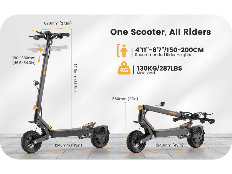 The AUSOM L1 is engineered to accommodate riders from 4'11" to 6'7" (150–200cm), thanks to its adjustable handlebar height (46.5"–54.3"). Whether you're commuting or cruising, the spacious 49-inch frame and solid build offer comfort and stability for riders up to 287 lbs (130kg) And when you're done riding It folds down to just 22 inches high, making it easy to store or carry.