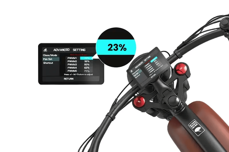 The advanced settings allow you to fully personalize the pedal assist (PAS) experience. You can individually define the power output—from 1% to 100%—for each of the 5 assistance levels.