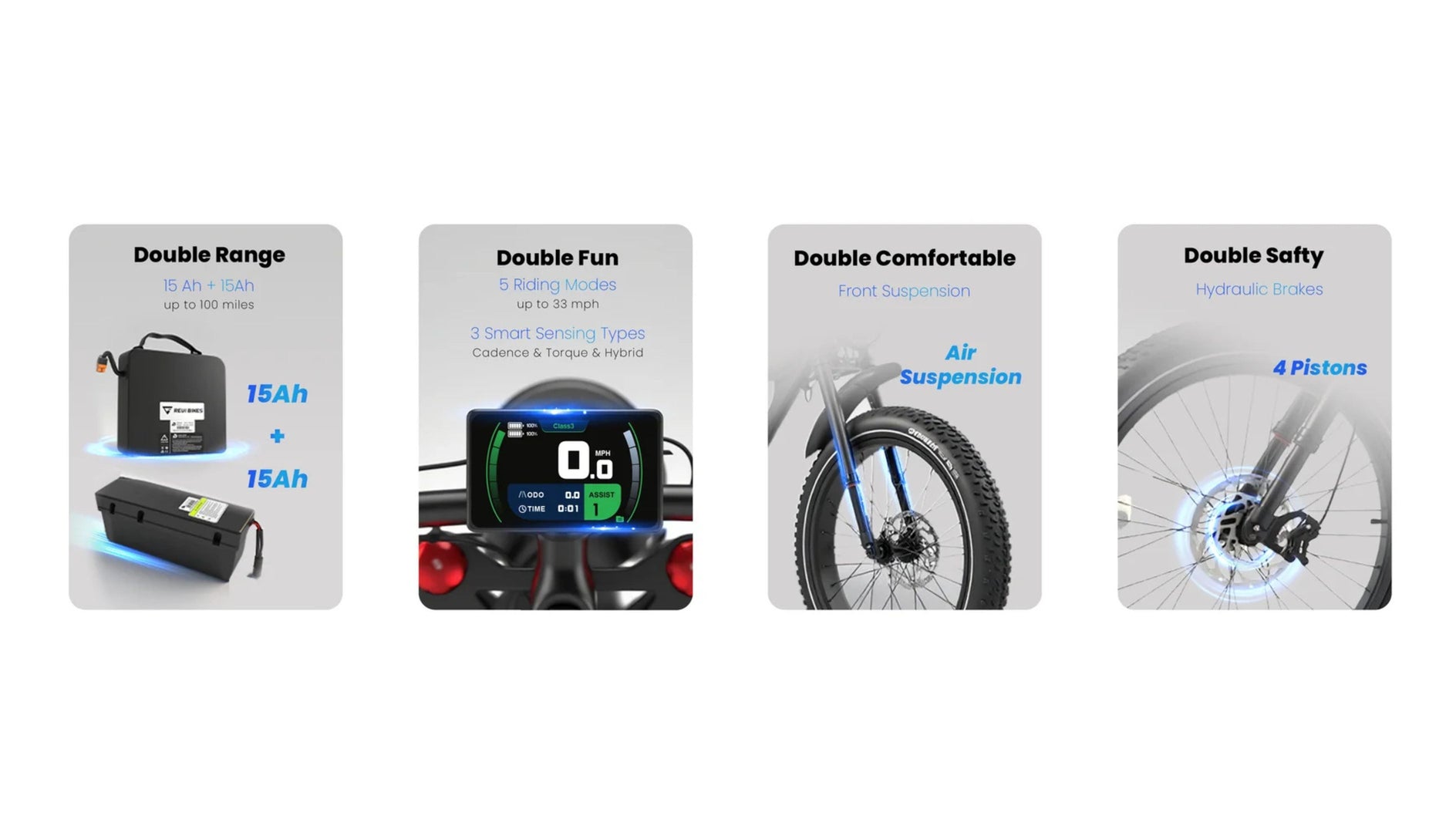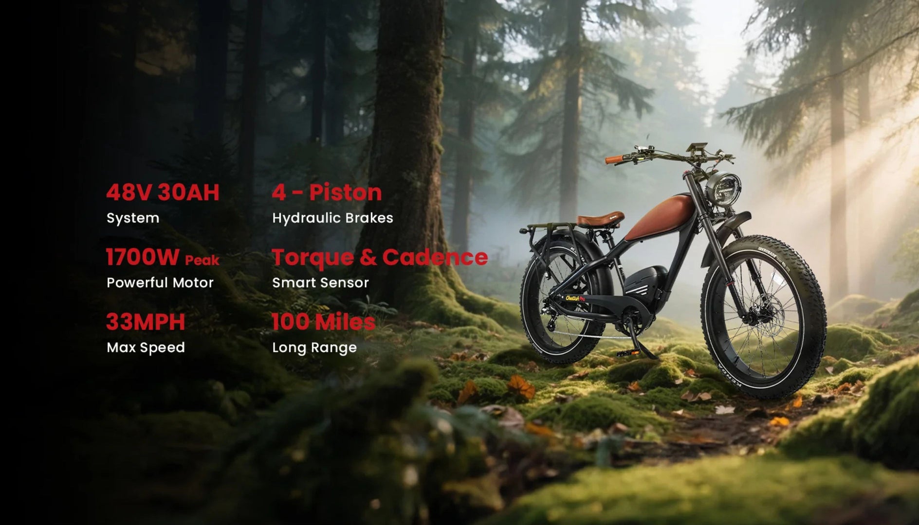 The Cheetah Pro merges vintage café‑racer styling with serious e‑bike performance. Powered by a 48 V motor rated at 1000 W with peaks up to 1700 W and generating around 115 Nm of torque, it handles steep inclines and city bursts with ease. A dual‑battery system (48 V, 15 Ah + 15 Ah) gives around 30 Ah of capacity and delivers up to 60‑100 miles of riding between charges under ideal conditions. The fat 26″ × 4.0″ tires, hydraulic disc brakes, and full‑color LCD with USB port enhance ride control, safety, and convenience. The ride control is elevated by “3 Smart Sensing Types” — Torque sensor mode for dynamic response, Cadence sensor for smooth cruising, and Hybrid mode that uses Torque sensing below ~13 mph and Cadence above that to optimize support. Whether commuting, cruising, or turning heads on the boulevard, the Cheetah Pro offers style, power, range, and intelligent ride‑sensing in one standout package.